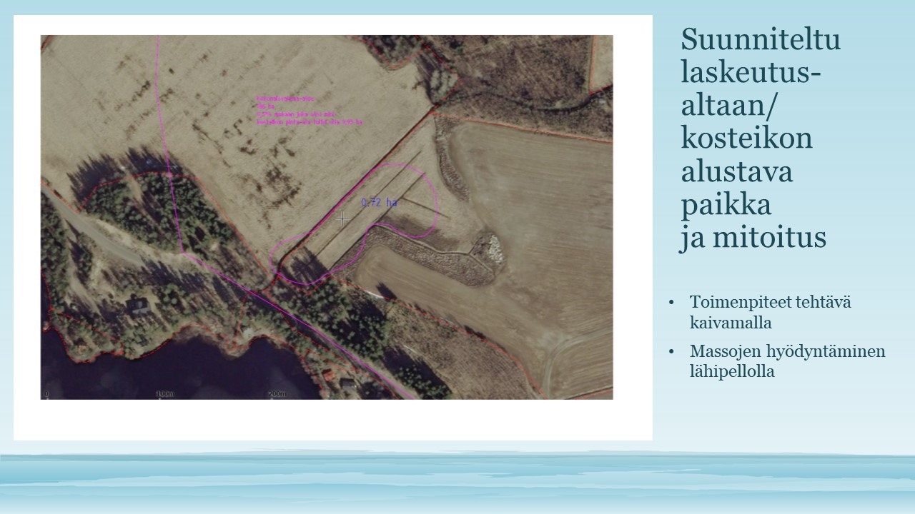 - Tässä hankkeessa olisi tarkoitus ensin rakentaa pelloilta laskevaan ojaan laskeutusallas vähentämään sieltä tulevaa kuormitusta.