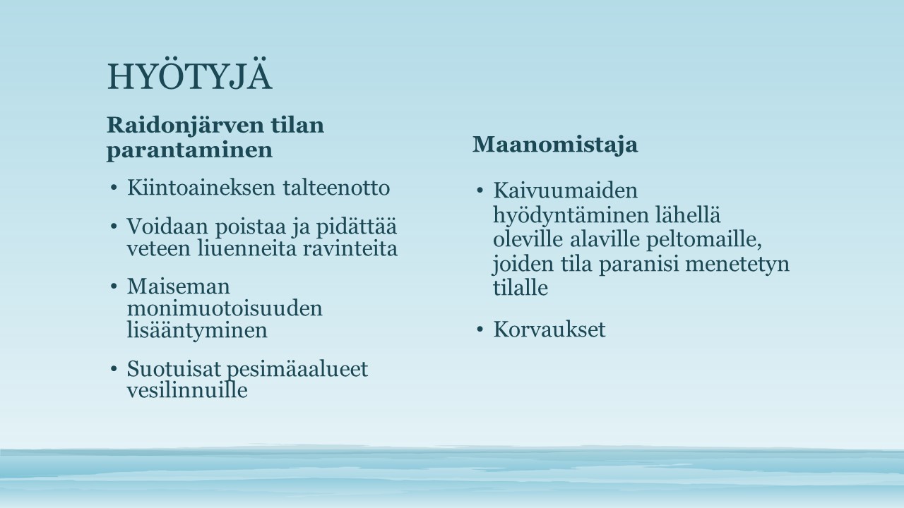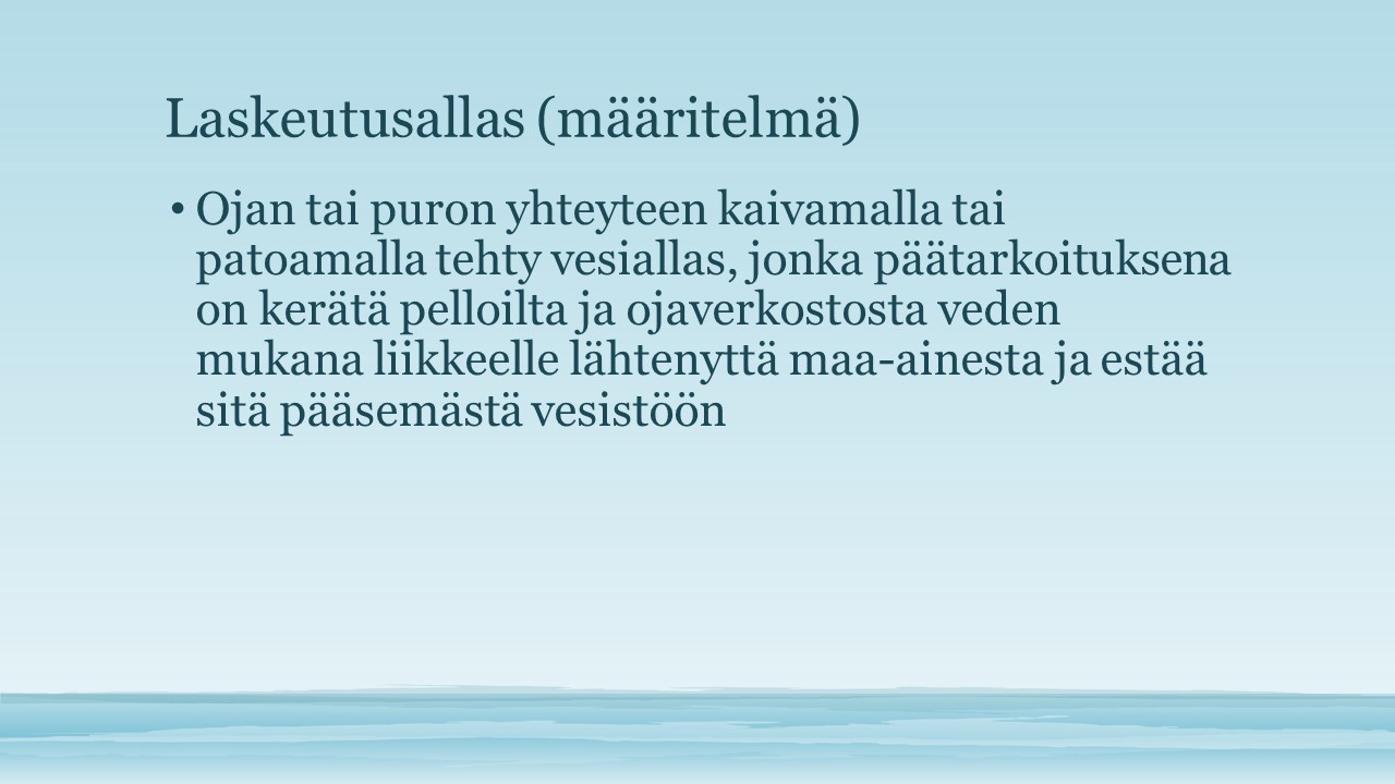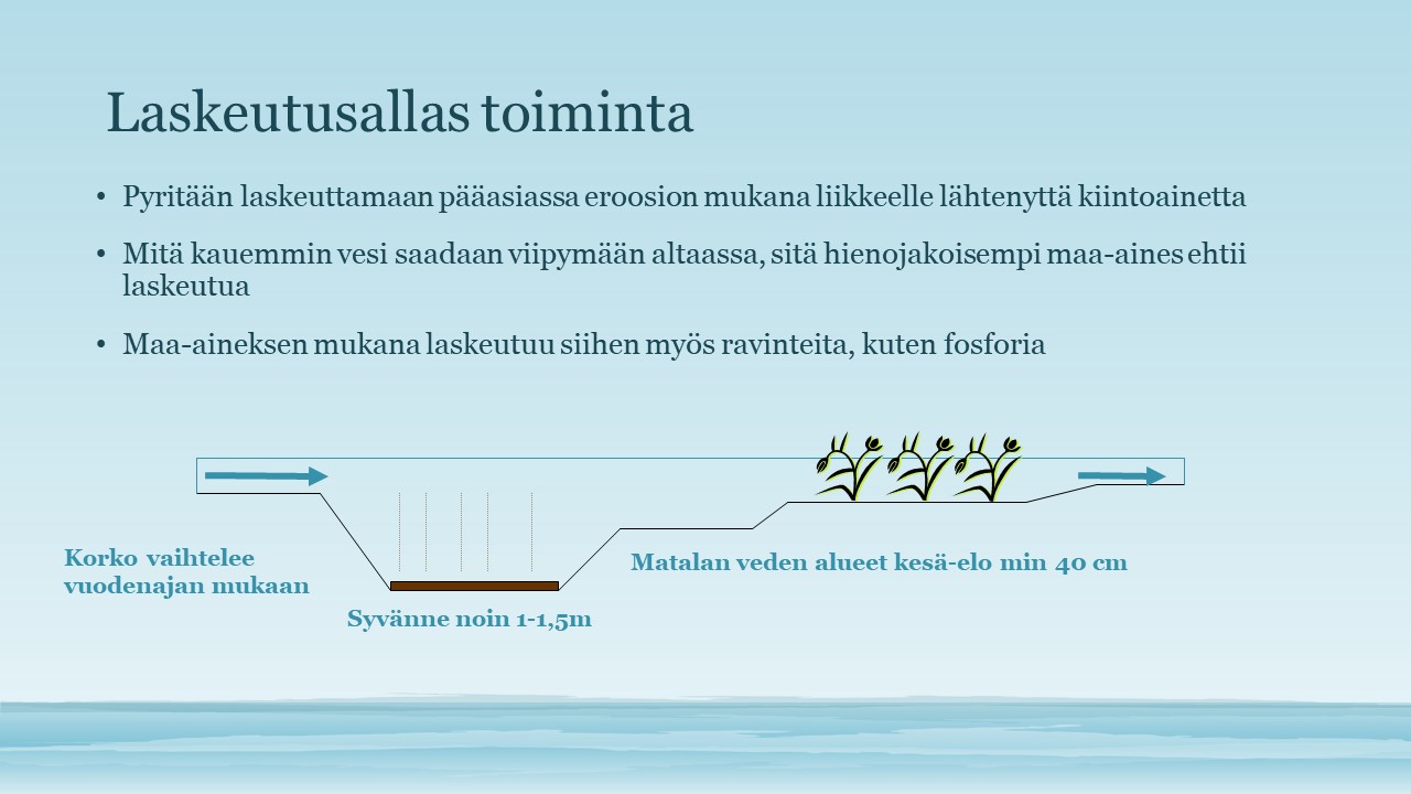 - Laskeutusaltaiden avulla saadaan estettyä kiintoaineen kerääntyminen järveen ja pitkällä aikajänteellä lasketusaltaisiin syntyy kosteikkoa, joka sitoo myös lannoitteista kertyvää kuormitusta.
