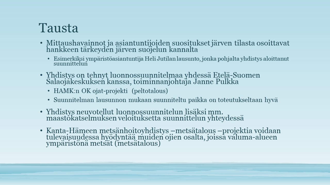 - Marraskuussa 2020 haimme lisärahoitusta hankkeeseen myös Hämeen Ely-keskukselta.